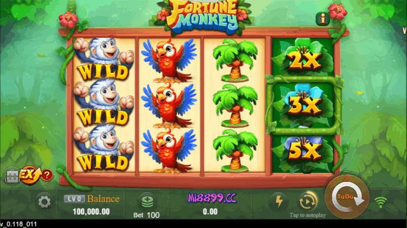 O Wild substitui TODOS os outros símbolos regulares do jogo para formar combinações vencedoras. Como não há Scatter no Fortune Monkey, o Wild é verdadeiramente universal.